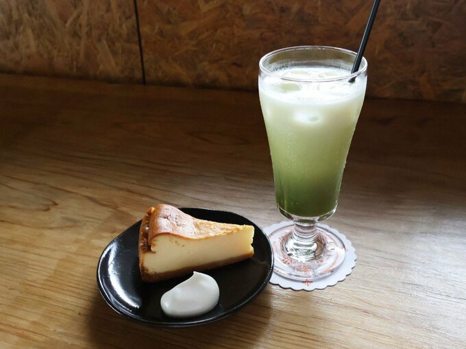 「チーズケーキ」(左、500円)と「アイス抹茶ラテ」(500円)