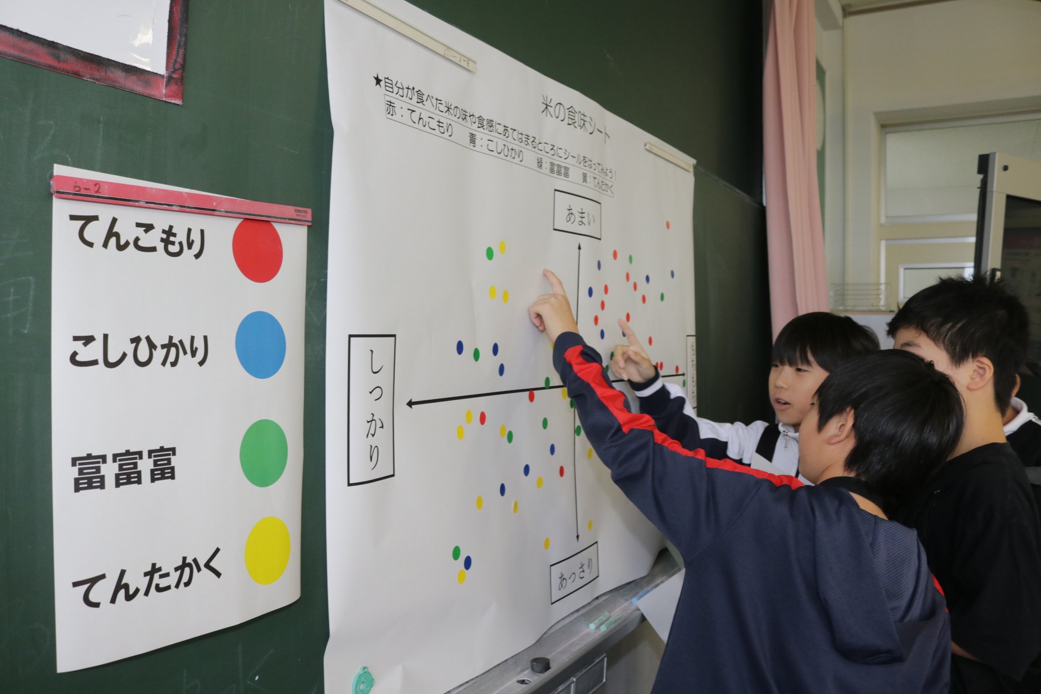 児童はグループに分かれて、「てんたかく」「コシヒカリ」「富富富」「てんこもり」の4品種と、コシヒカリの五分づき米と玄米を鍋で炊いた。蒸らし終わってふたを開けると「いいにおい」と感激。4品種を食べ比べ「甘めでしっかりしているかも」などと感想を言いながら味わった。