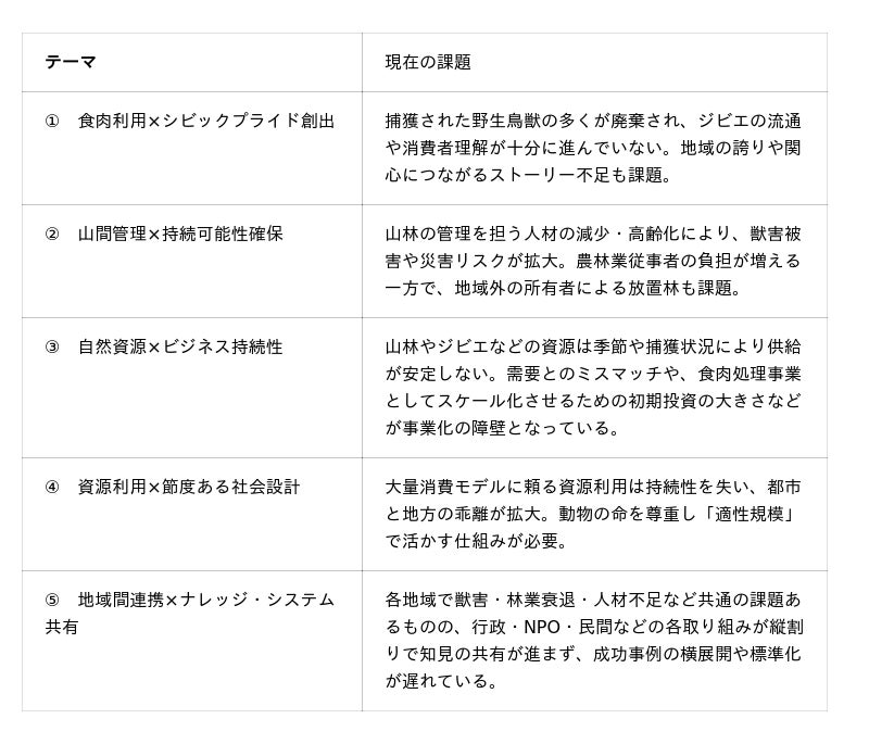 本プログラムでは、山を起点にした事業創出の可能性を、以下のテーマに基づき検討します。