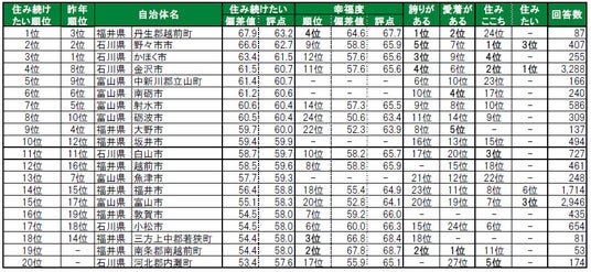 住み続けたい街は、1位福井県丹生郡越前町。2位は2年連続で石川県野々市市。3位石川県かほく市。