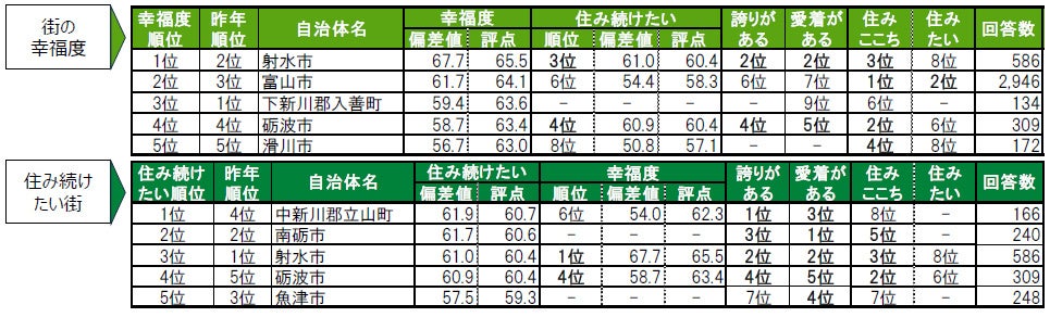 街の幸福度は、1位射水市、2位富山市、3位下新川郡入善町。