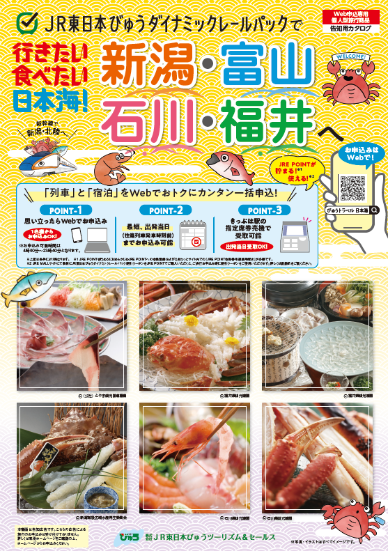 往復の列車と宿泊などがセットでおトクな価格変動型の個人旅行商品『JR東日本びゅうダイナミックレールパック』では、日本海の幸を堪能できる専用プラン「行きたい 食べたい 日本海!」プランをびゅうトラベルサイトにて、販売しております。また、旬の食材や時期を紹介した観光パンフレットをJR東日本の主な駅、駅たびコンシェルジュに展開しております。