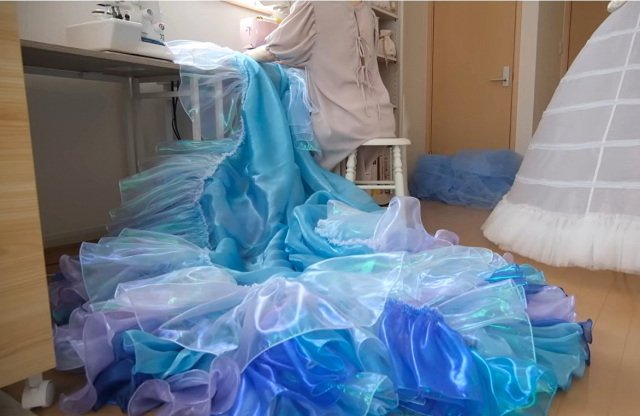 「動いた時や裾を持ち上げた時に『複雑に色々な色味が見えつつも全体的には青っぽいグラデーション』が見えるように作りたいと思っていました。近所の手芸店では、納得のいく生地を見つけることが出来ず、ネットショップで集めることにしたのですが、まずは候補の布を少量ずつをサンプルとして頼んでみて、良ければドレスに必要な分量を計算して再度注文をする、という動画内には含まれていない地道な裏作業があったんです。最終的なドレスの構造と使用する生地を決定するまでに1ヵ月はかかっていたと思います」