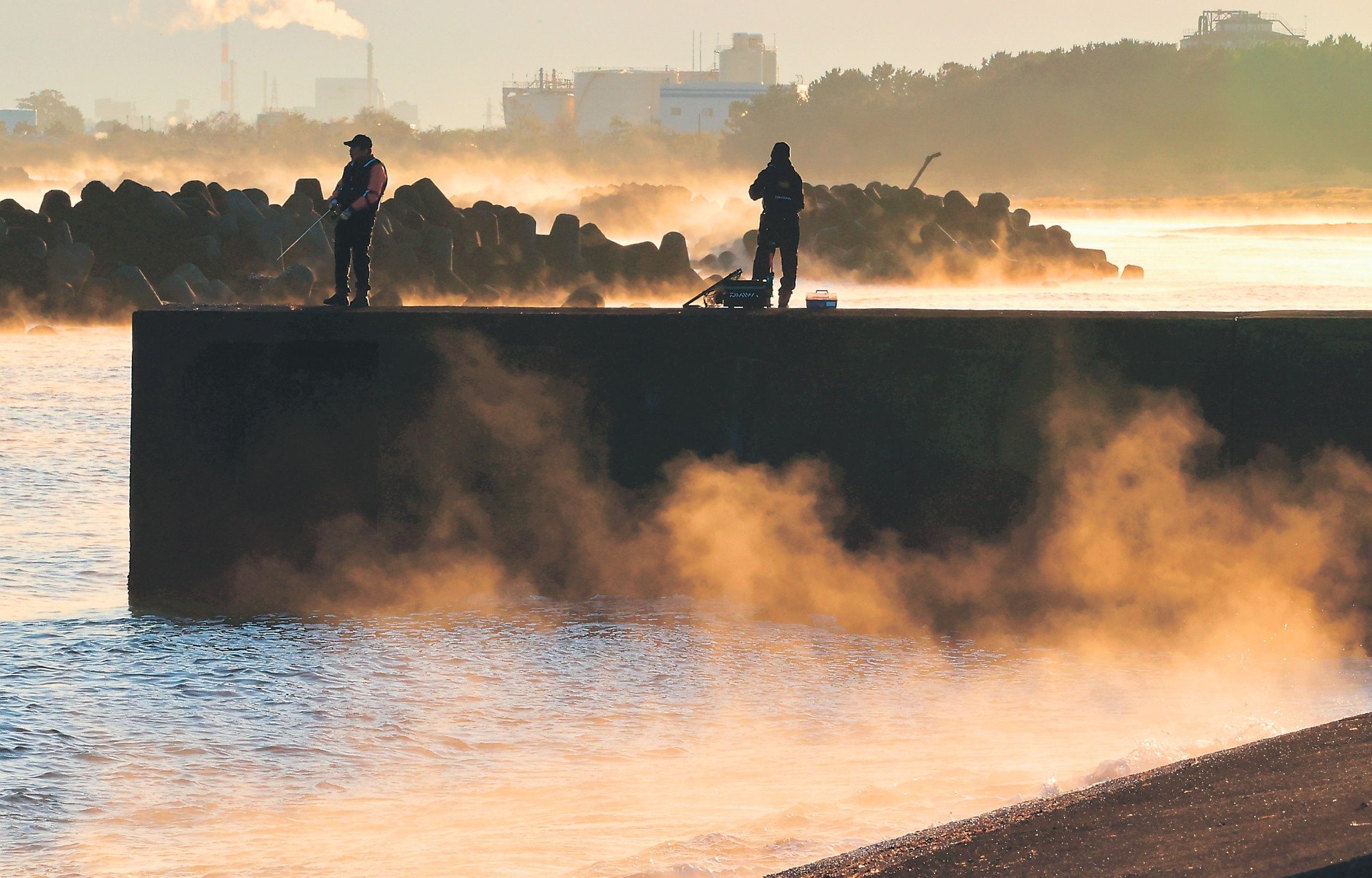 富山市の八重津浜では午前6時半ごろ、海面からの水蒸気が冷たい空気によって霧となり煙のように見える「気嵐(けあらし)」が、波打ち際に続いた。朝日を受け、一帯はオレンジ色の幻想的な雰囲気に包まれる中、釣りをする人の姿が見られた。