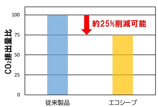 CO2削減効果エコシープは、副産物羊毛を主原料とした植生シートで、従来の化学繊維製品と比べ製造時のCO2排出量を約25%削減可能であると推定しています(自社試算)。