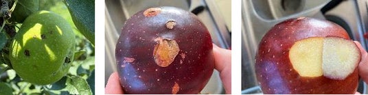 (左)雹によってできた傷 (中央)赤く色づき傷はカサブタ状に (右)果肉に影響なし