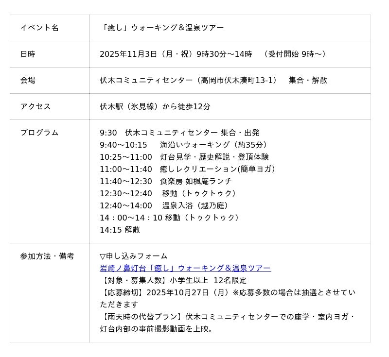 岩崎ノ鼻灯台利活用プロジェクト実行委員会は、11月3日(月・祝)に岩崎ノ鼻灯台を見て学んで体感する「癒し」ウォーキング&温泉ツアーを開催いたします。このイベントは、日本財団「海と日本プロジェクト」の一環として、灯台を中心に地域の海の記憶を掘り起こし、地域と地域、異分野と異業種、日本と世界をつなぎ、新たな海洋体験を創造していく「海と灯台プロジェクト」の助成を受けて実施します。