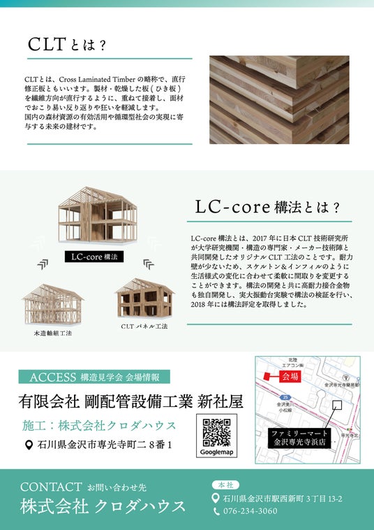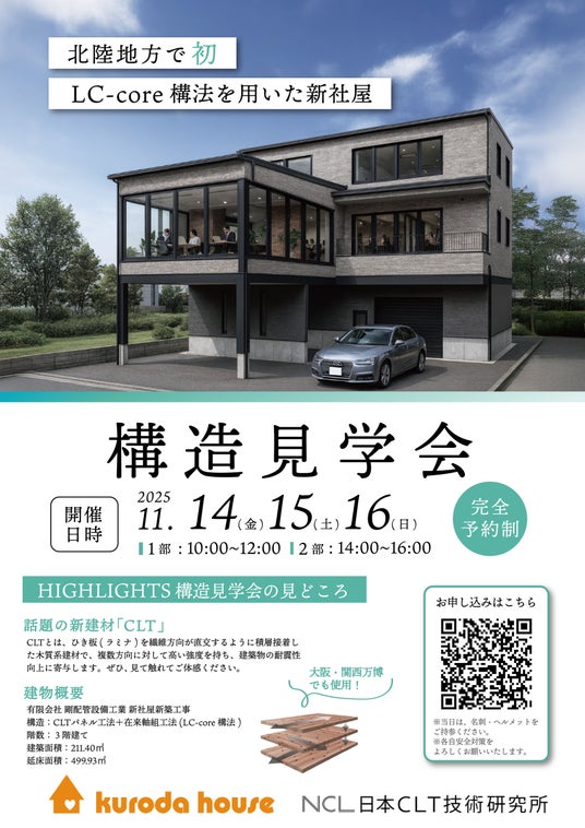 ライフデザイン・カバヤ株式会社(代表取締役社長:窪田健太郎/本社:岡山県岡山市)が運営する、CLTフランチャイズネットワーク本部『日本CLT技術研究所』の加盟企業である株式会社クロダハウス(代表取締役社長:東一寛/本社:石川県金沢市)は、現在建築中である有限会社剛配管設備工業(取締役社長:山口進/本社:石川県金沢市)のオリジナルCLTパネル工法「LC-core構法」を用いた新社屋において、2025年11月14日(金)~16日(日)の3日間、北陸地方で事務所や店舗・施設などの非住宅の建築をご検討されている方から非住宅木造建築事業をご検討されている住宅会社様や建設会社様を対象に完全予約制の構造見学会を開催いたします。