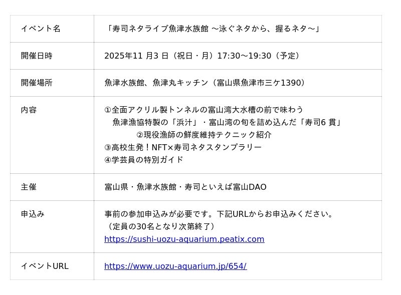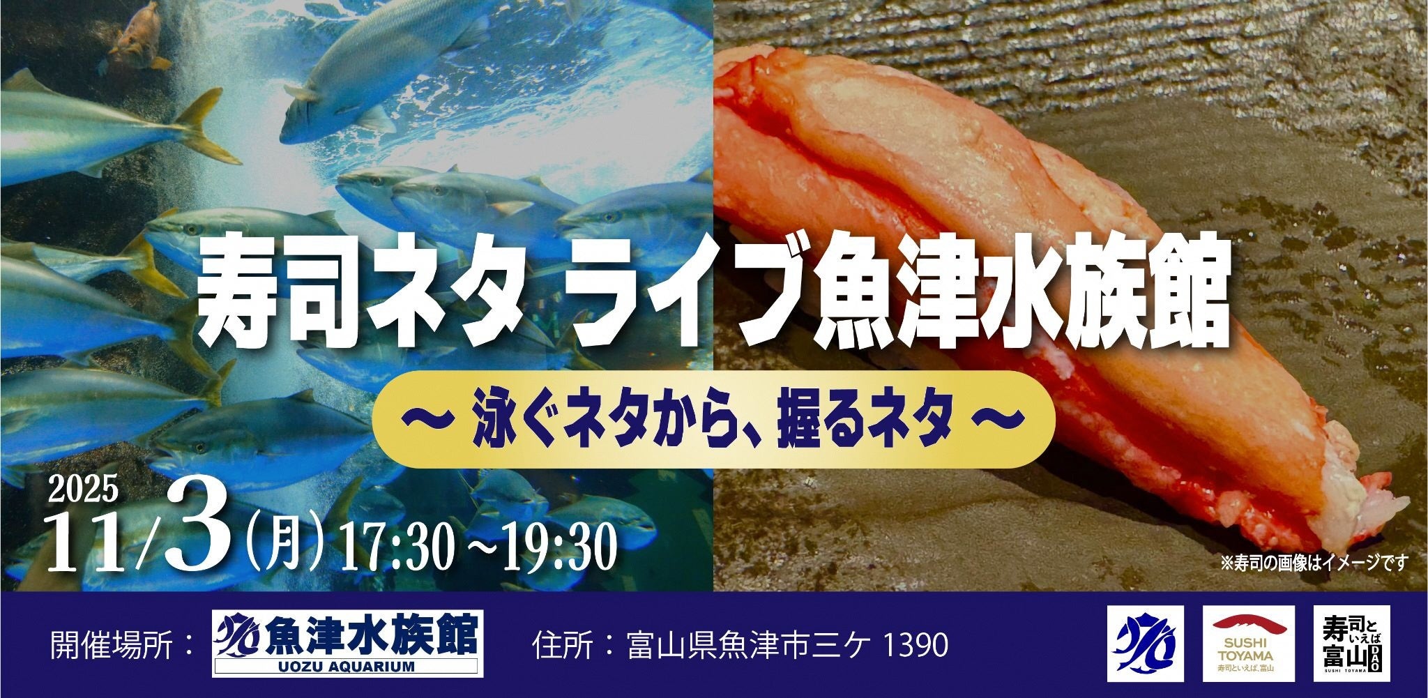 現存する日本最古の魚津水族館で、目の前の魚が“寿司になるまで”を「見て・知って・味わい」ながら楽しむ特別イベント「寿司ネタライブ魚津水族館~泳ぐネタから、握るネタ~」を開催します。