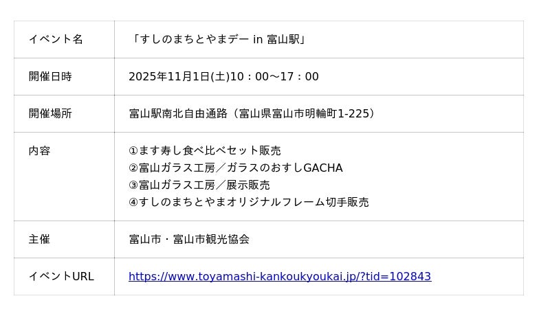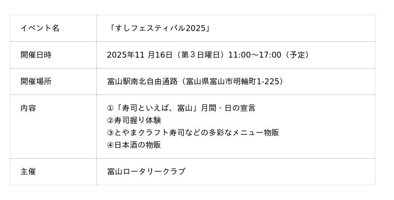 ■「寿司といえば、富山」の日、制定記念!「すしフェスティバル2025」を開催!11月16日には、官民が一体となって「寿司でおもてなし」をするイベント「すしフェスティバル2025」を富山駅で開催します!地域、企業、行政が一体となり、「すし県とやま」を盛り上げます。