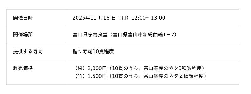 「寿司といえば、富山の日」の制定を記念し、「寿司といえば、富山」を盛り上げるため、「お寿司なら県庁食堂でも食べれます」をコンセプトに、富山県庁食堂で富山の寿司を数量限定で販売します。