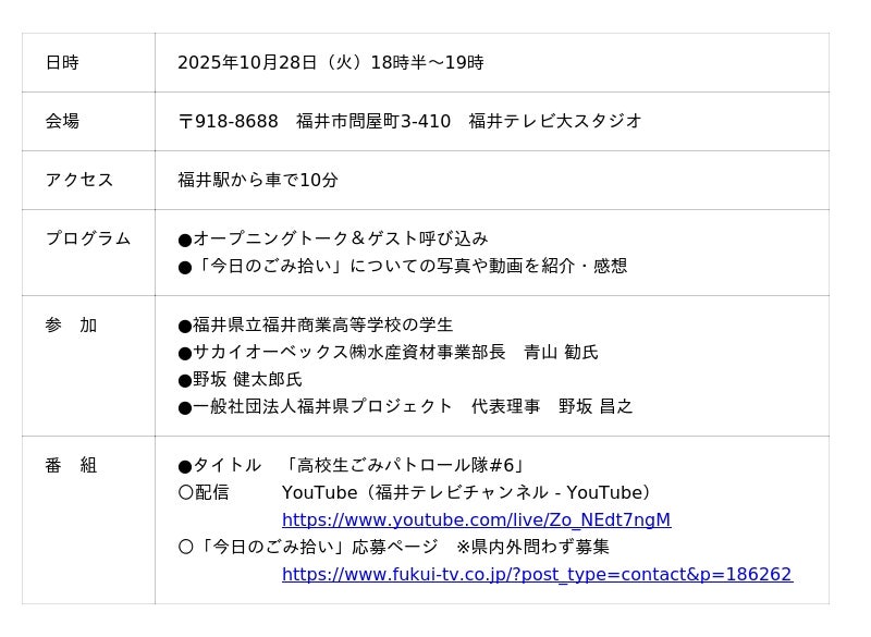 一般社団法人福丼県プロジェクトは、10月28日(火)に「高校生ごみパトロール隊」生配信の6回目を放送いたします。この生配信は、日本財団が推進する海洋ごみ対策プロジェクト「海と日本プロジェクト・CHANGE FOR THE BLUE」の一環で開催するものです。
