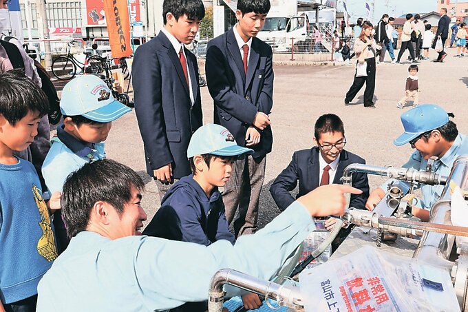同市山室地区地域共生プロジェクトチームが実施。給水車が配置され、子どもたちが給水袋への水くみを体験した。