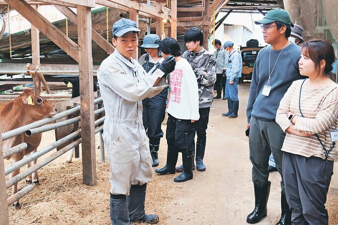 参加者は同牧場で広島県出身の職員から堆肥の作り方や飼料の管理、子牛から乳牛になる過程などの説明を受け、牛への餌やりや乳搾りに取り組んだ。サトイモの収穫もした。