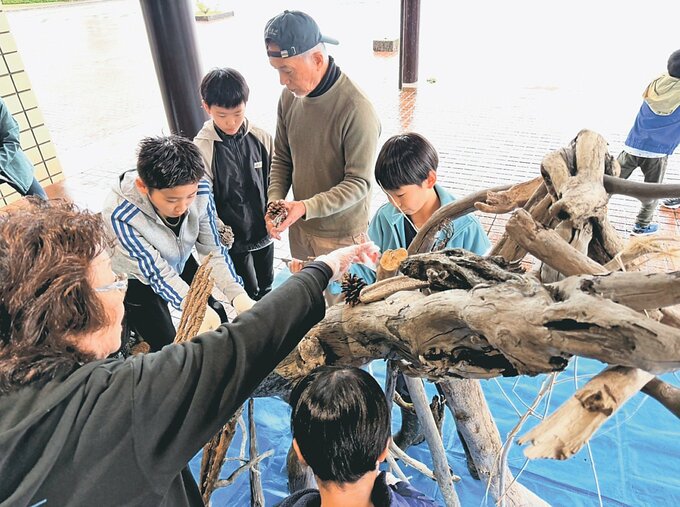 2日目は町役場前で恐竜作りに取り組んだ。大きな流木を胴体にして目を貝、うろこを松ぼっくりやワカメなどで表現して飾り付けた。高さ約1・8メートル、長さ約2メートルの巨大恐竜が完成すると、笑顔があふれた。制作した恐竜は町文化体育センター・サンリーナ前に展示される。