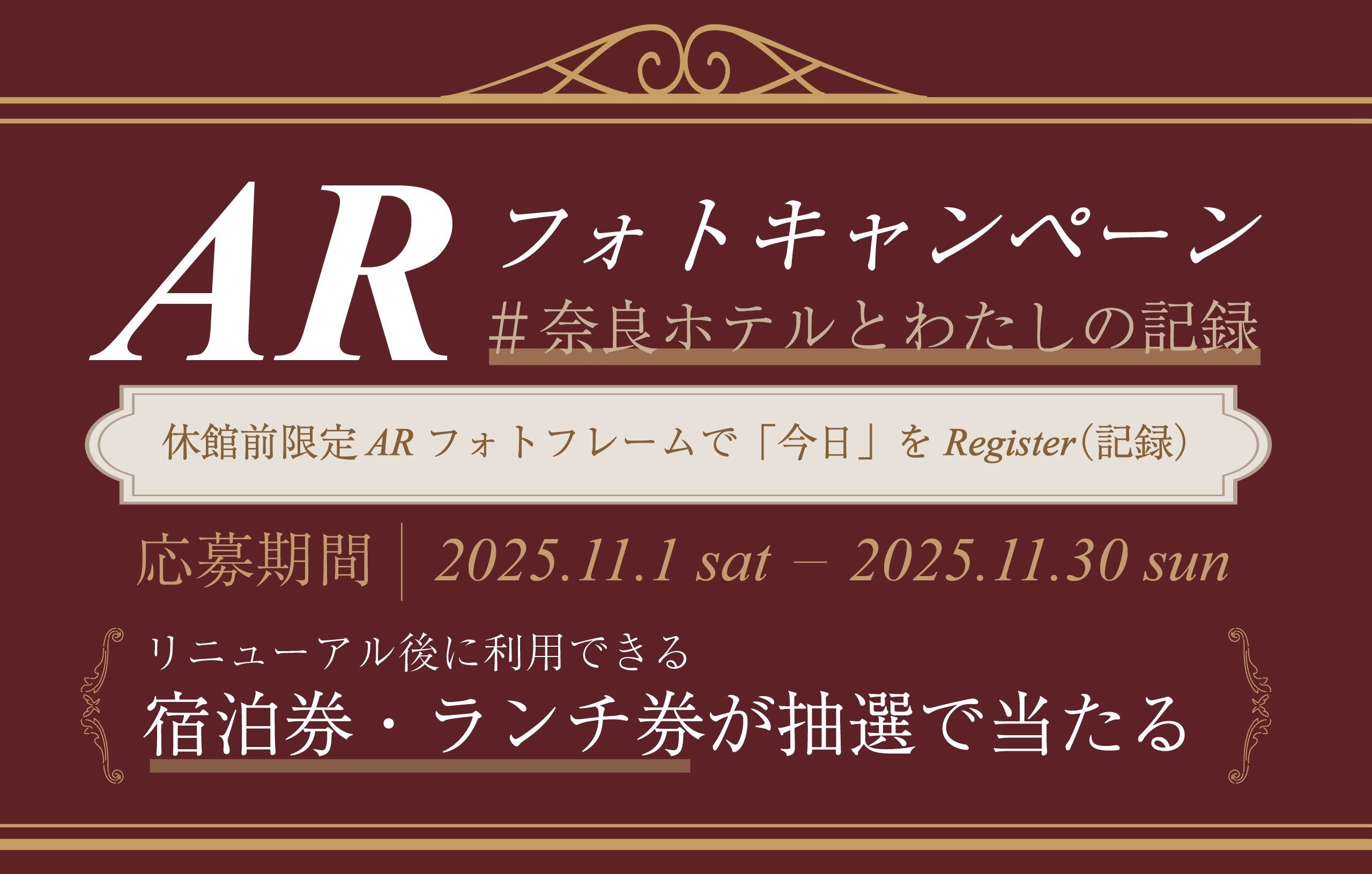 奈良ホテル(奈良市高畑町1096、総支配人 原田隆太)は、休館前プロモーション「“Register” ―今を記録し、未来へ―」の第二章として、2025年11月1日(土)から11月30日(日)までの期間、ARフォトキャンペーンを実施いたします。