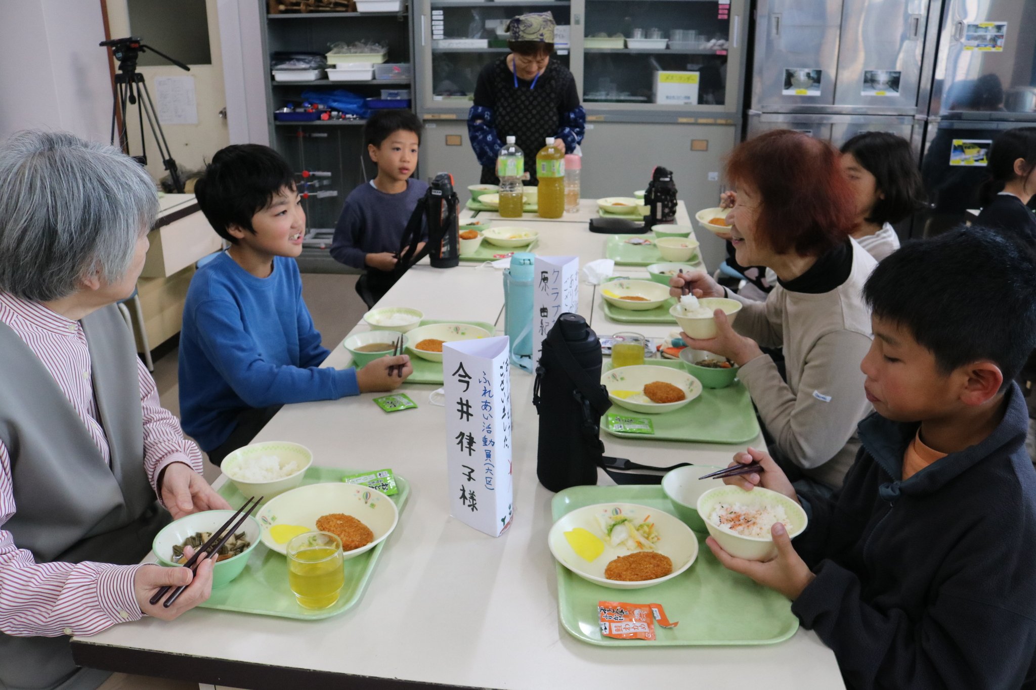 3、4年生は学校農園で育てたサトイモ、5年生は田植えと稲刈りだけでなく、育苗や除草、害虫対策まで取り組んだコシヒカリを食材として準備。芦峅寺の佐伯照代さんに指導を受けご飯を炊き、つぼ煮を調理した。料理が完成すると、地域住民と児童は一緒に食べ、交流を深めた。
