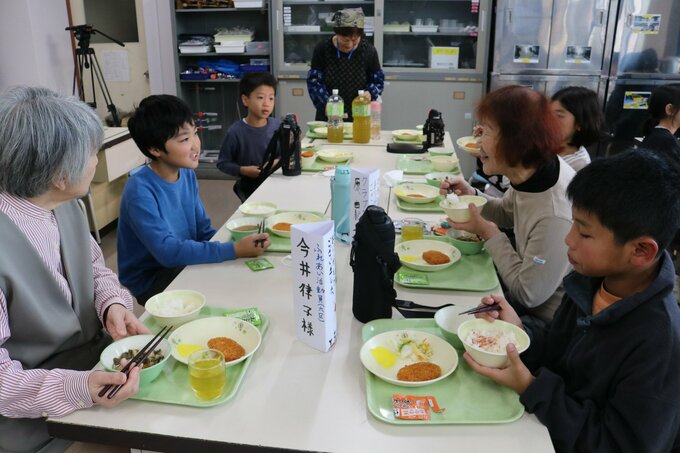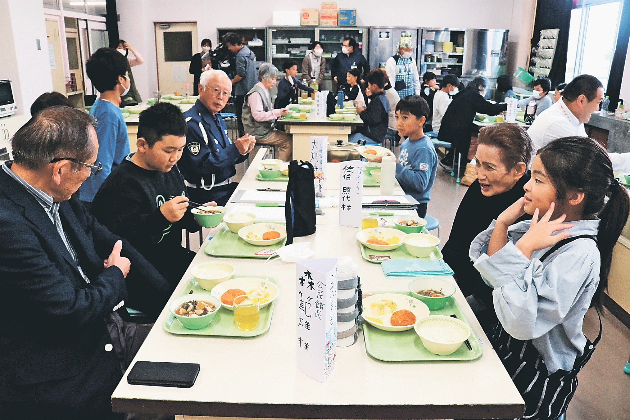 コメ作りに協力した農家の山形哲雄さんは「育苗から夏休みの害虫対策まで子どもたちはとにかく熱心。料理もおいしかった」と笑顔を見せた。5年の浦口愛花さんは「喜んでもらえてうれしい。ありがとうという思いを込めた」と満足そうな表情で話した。
