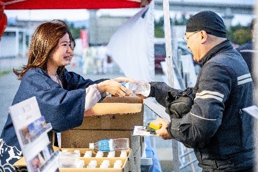 2日目のスタート地点は、中間イベント会場である富山県射水市の海王丸パークにて開催されました。富山県射水市より、参加者へ地元名物の「ますの寿司おにぎり」と「立山玉殿の湧水」が振る舞われ、温かいおもてなしが提供されました。
