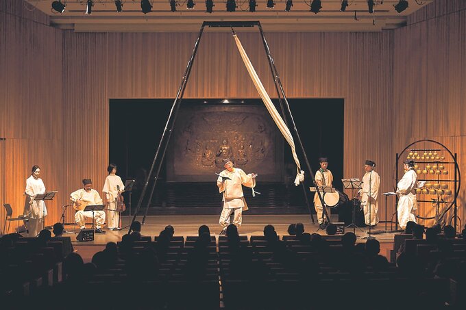 奈良時代に大陸から伝わった複合芸能「散楽」を現代風に再現するパフォーマンス集団「現代散楽」が上演した。雅楽演奏家の太田豊さん(富山県小矢部市出身)ら6人でつくるグループで、演奏会ではおりんを調律した楽器「久乗編鐘(きゅうじょうへんしょう)」や笙(しょう)、和太鼓を組み合わせた楽曲や曲芸を披露した。大仏殿で新曲も奉納演奏した。