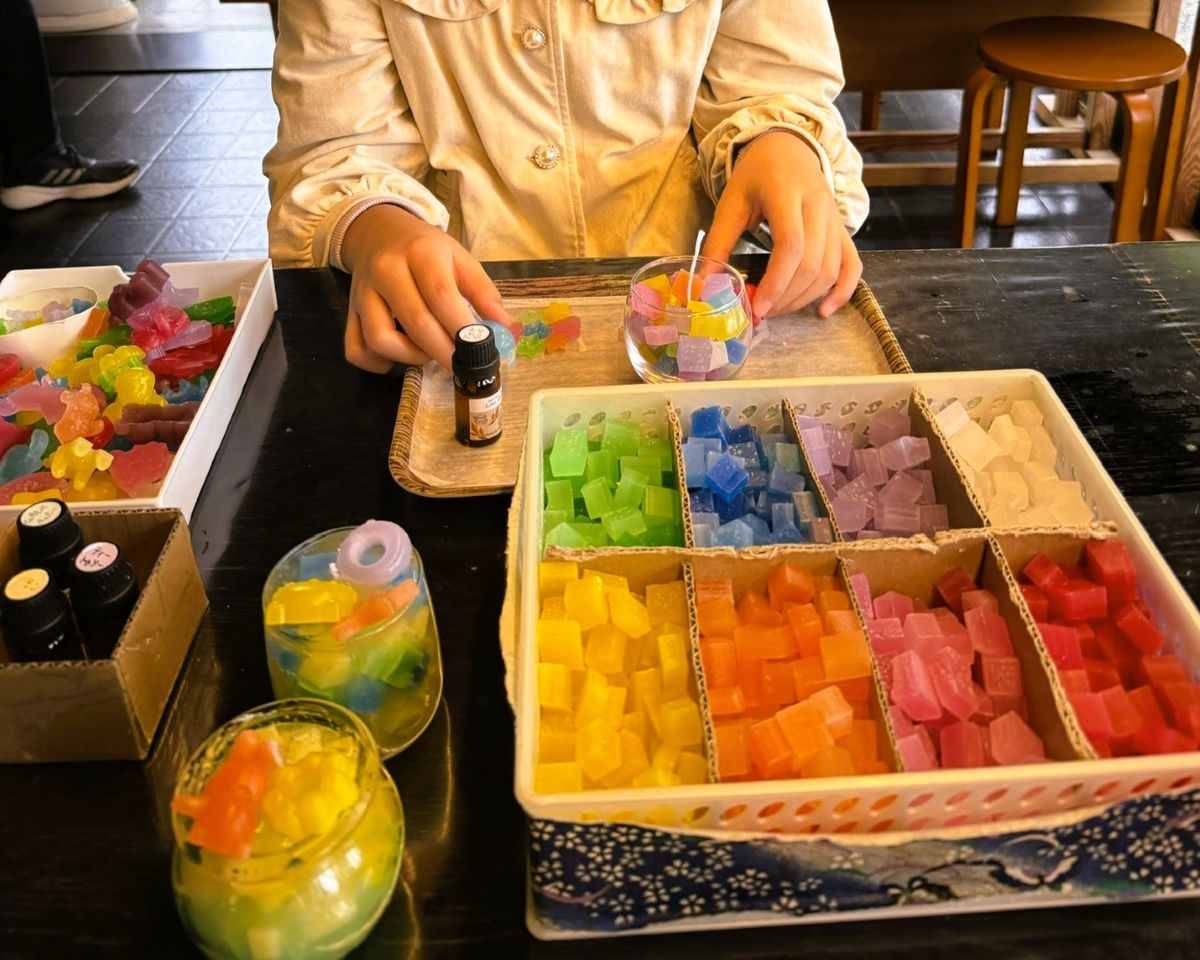 色とりどりのブロック型のロウソクを好きなガラス瓶に入れて固め、アロマオイルをかけて出来上がりです!