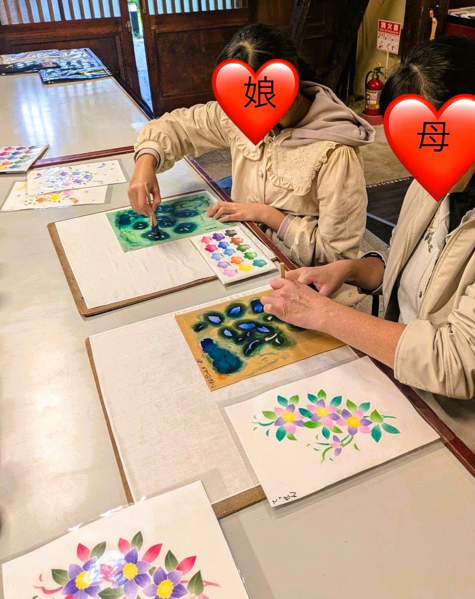 型染めは、ただベターっと色をつけるのではなく、刷毛を回しながら描くことで濃淡が出来て、友禅特有のぼかしになるそうですが、なかなか難しかったようです。