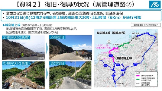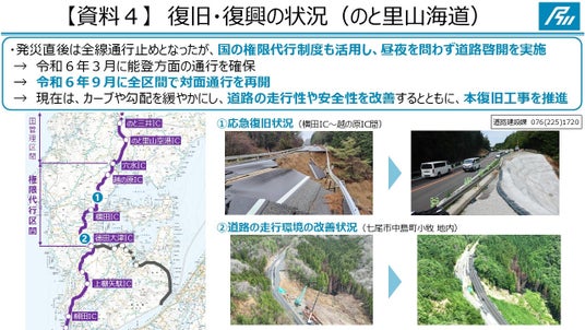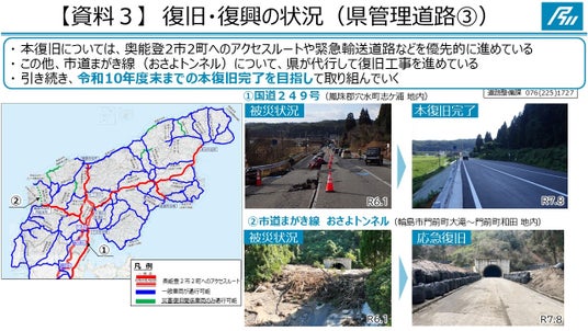のと里山海道については、地震により、盛土の大規模な崩落や、路面に亀裂や段差が発生するなどの被害が生じ、発災直後は全線通行止めとなりましたが、石川県では国と連携し、昼夜を問わず道路啓開を実施し、令和6年3月に能登方面の通行を確保し、同年9月には全区間で対面通行ができるようになりました。