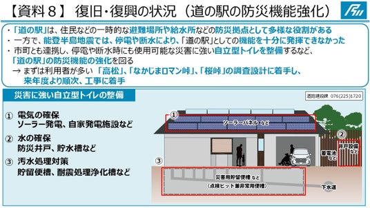 このため、県内の市や町とも連携し、停電や断水時にも使用可能な災害に強い自立型トイレを整備するなど、「道の駅」の防災機能の強化を図ることとしています。