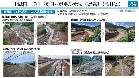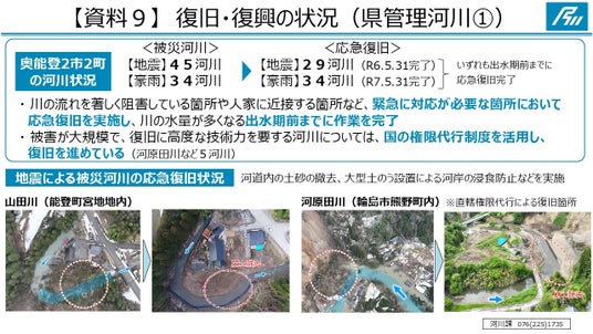 河川の復旧・復興の状況につきましては、奥能登2市2町では、地震により45河川、豪雨により34河川が被災しました。このうち、川の流れを著しく阻害している箇所や、人家に近接する箇所など、緊急に対応が必要な箇所において、応急復旧を実施し、川の水量が多くなる出水期前までに作業を完了させてきました。また、被害が大規模で、復旧に高度な技術力を要する河原田川など5河川については、国の権限代行制度を活用し、復旧を進めています。