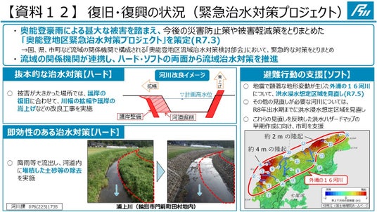 また、ソフト対策では、住民の避難行動を支援するため、地震で顕著な地形変動が生じた外浦の16河川で、洪水浸水想定区域を今年5月に見直し、その他の見直しが必要な河川については、令和8年の出水期までに洪水浸水想定区域を見直すこととしています。