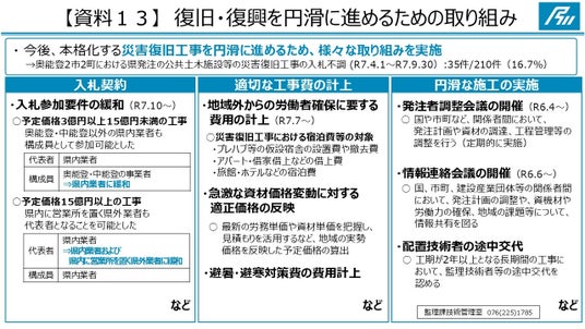 適切な工事費の計上の取り組みとしては、地域外からの労働者を確保するため、今年7月から、中能登および奥能登の災害復旧工事に従事する技術者・作業員の宿泊先を確保する費用を災害復旧工事に計上することが可能となりました。