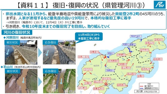 河川が増水するリスクが少ない非出水期となる11月からは、能登半島地震や奥能登豪雨により被災した奥能登2市2町の45河川のうち、まずは、人家が連坦するなど優先度の高い19河川について、本格的な復旧工事に着手することとし、このうち、輪島市の河原田川については、11月4日から工事に着手します。