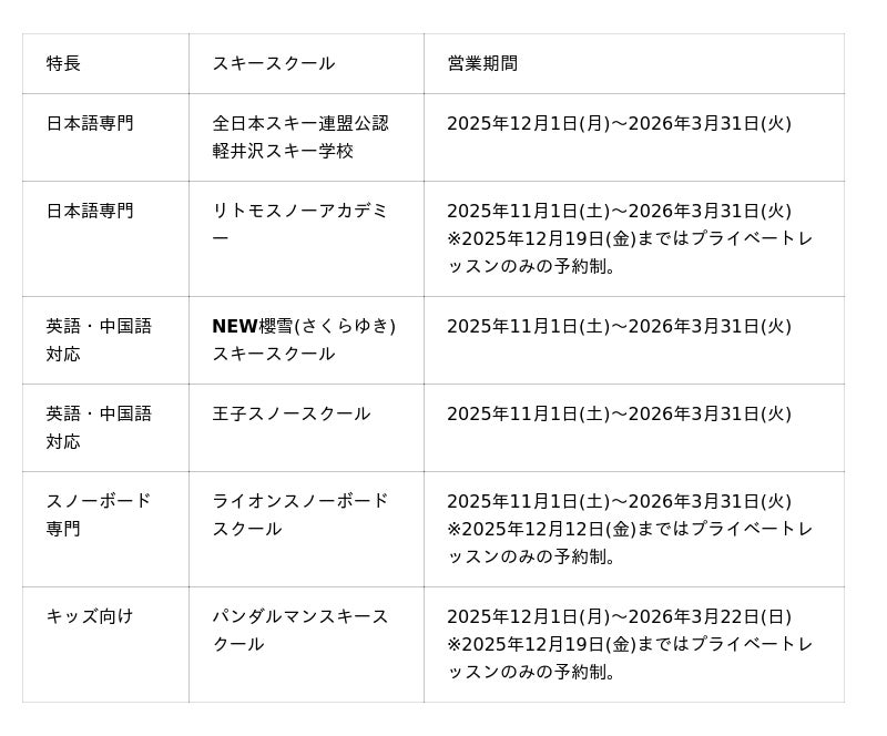 ❅ NEW ゲレンデデビューをサポートする「デビューパーク」新エリア造設(2025年12月下旬より)❅ NEW 訪日客向け英語・中国語対応のスクールを追加-スクールは合計6校に―(英語・中国語対応2校、日本語専門2校、スノーボード専門1校、キッズ向け1校)