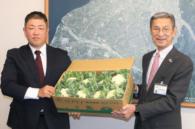 富山県の入善、朝日両町のカリフラワー生産者でつくる「ロジケン(露地野菜研究会)」は30日、入善町にカリフラワー82・1キロを寄付した。町内8小中学校の給食で提供される。