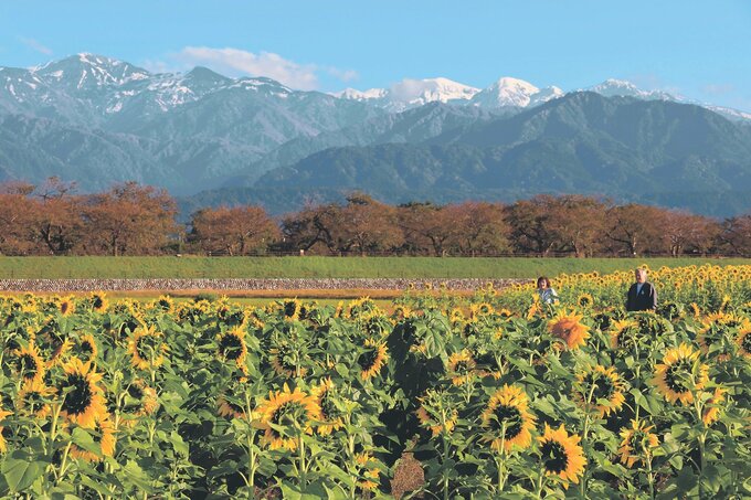富山県朝日町舟川新の舟川べり近くでヒマワリが咲き誇っている。30日は冠雪した北アルプス、ほのかに色づく中腹の木々、桜並木の紅葉が鮮やかな黄色と「秋の四重奏」を奏でていた。