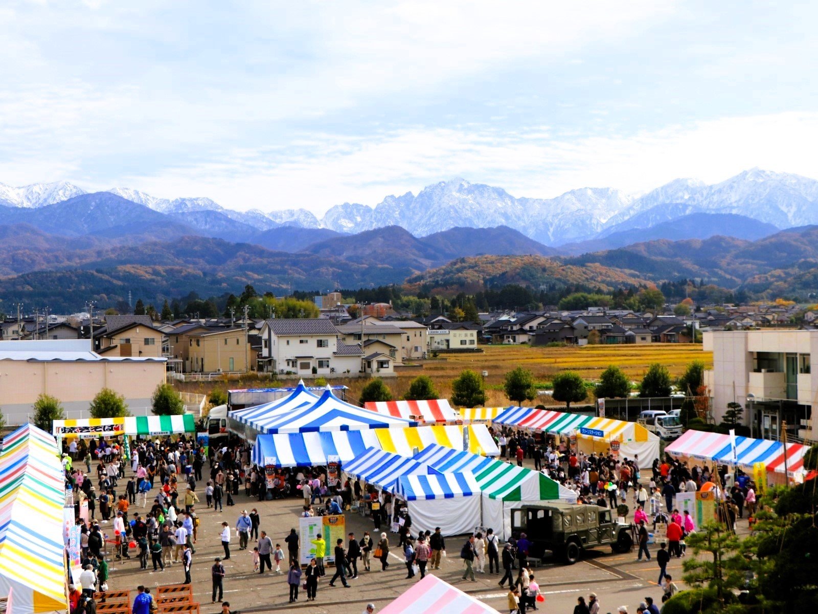 北アルプス剱岳の絶景のもと、秋の恵みを満喫する一日。上市町産里芋・富山県産牛肉などを使用したKAMI鍋をはじめ、地元ならではのグルメが一堂に会します。子どもたちに人気のバックホーを使ったボールすくい体験やはたらく車の展示もあるよ。