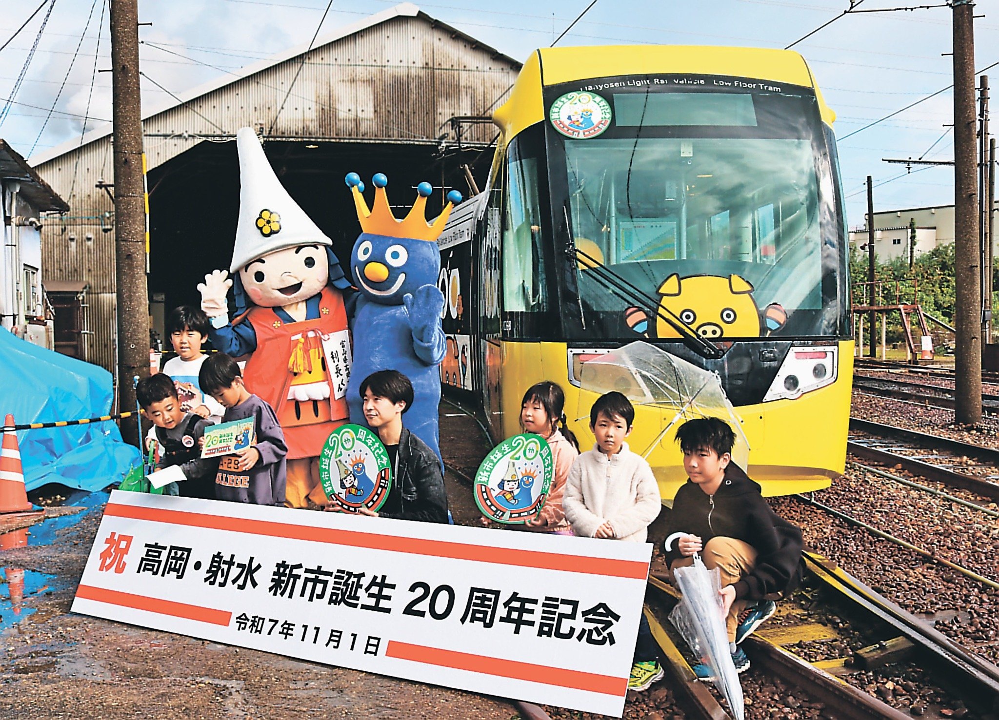高岡、射水の新市誕生20周年を記念した万葉線ステッカーのお披露目式が1日、富山県高岡市の万葉線株式会社であり、ステッカーを付けた電車の運行が始まった。