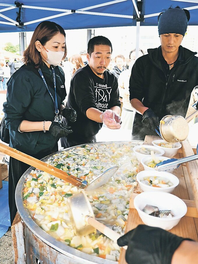 市内の3農協と2漁協が旬の食材を提供した「20周年特別大漁鍋」と、エゴマのみそおにぎりセットが限定300食で販売された。