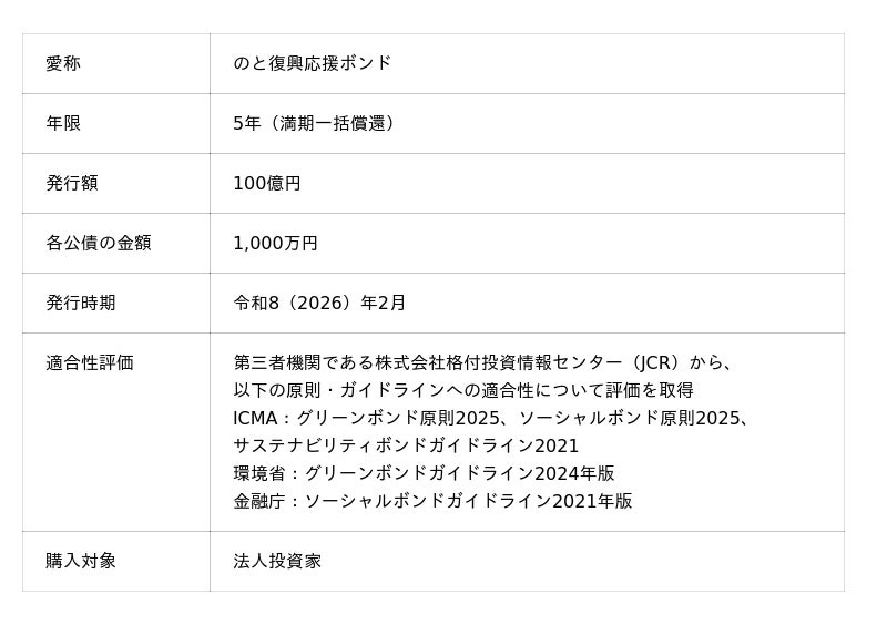 大和証券株式会社(本社:東京都千代田区、代表取締役社長 荻野明彦、以下「大和証券」)は、石川県(馳浩知事)が2026年2月に発行を予定するサステナビリティボンド(以下「本債券」)を、石川県内の支店および全国の大和証券窓口でご購入いただけることをお知らせいたします。