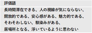 以上より、平行配置は、「座りやすさ」「馴染みやすさ」の評価が高く、気軽にできる行動が多かったことから短時間利用する場所に適している一方、回転配置は座る位置によって心理評価が大きく異なり、実際に行われていた行動、滞在時間からは長時間利用する場所に適していることが分かりました。
