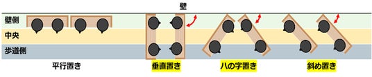 近年、”人々の集える場所”として認識が高まりつつあるベンチは、屋外空間をサードプレイスとして活用する際に多く設置されるようになりました。一般的にベンチは設置される通路に対して「平行」に配置されますが、2023年度の研究では建物の列柱間に設置されたベンチの配置「平行」に加えて、通路に対して直角に置いた「垂直」、2つのベンチを内向きにした「ハの字」、同じ方向へ斜めに向いた「斜め」の4通りに設定しました。結果、「斜め」の時は、行動に合わせて座席を選択していることが明らかとなり、ベンチの配置によって利用状況が変わる可能性が示唆されました。