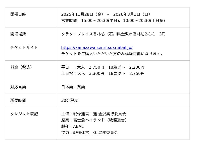 株式会社テレビ金沢(石川県金沢市 代表取締役社長 原田康久)は株式会社電通(東京都港区 代表取締役 執行役員 佐野傑)、株式会社ABAL(東京都目黒区 代表取締役・CEO 尾小山良哉)と共に、11月28日(金)からクラソ・プレイス香林坊(石川県金沢市香林坊2-1-1)3Fで、XR(拡張現実)技術を用いたVRホラーアトラクション『戦慄迷宮:迷』を開催いたします。
