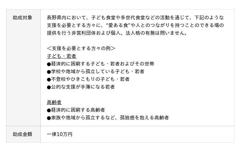 食を通じた支援活動を長野県内で実施する団体・個人が対象