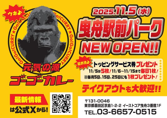 株式会社ゴーゴーカレーグループ(本社:石川県金沢市、CEO兼代表取締役社長:西畑誠、以下 ゴーゴーカレー)は、2025年11月5日にゴーゴカレー曳舟駅前パークをオープンします。