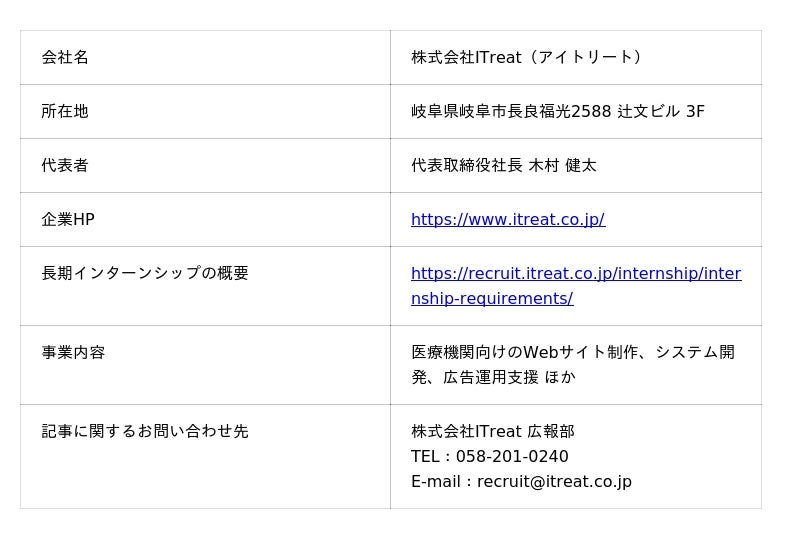 医療業界に特化したWeb制作・システム開発を手掛ける株式会社ITreat(本社:岐阜県岐阜市、代表取締役社長:木村健太)は、岐阜や愛知など地方で学ぶ学生に“働きながら就活の武器を身につける場”を提供する長期インターンシップ制度を導入してから2年を迎えました。