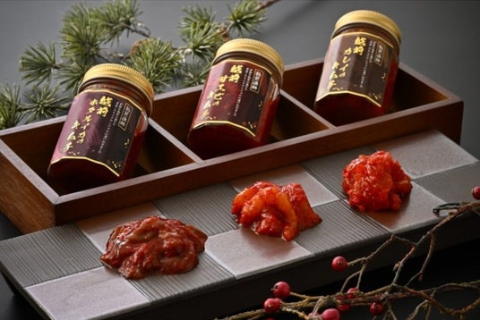越前漁師の福丸フーズがおすすめする、越前産海の幸を使ったキムチの詰め合わせセットです。地元越前港で水揚げされた赤ガレイ・甘エビ・ホタルイカをそれぞれキムチ漬けに仕上げており、各80g入りの小パックが2個ずつ入っています。海鮮の旨味とピリ辛キムチの絶妙なハーモニーが楽しめる逸品で、ご飯のお供にはもちろん、お酒のおつまみや贈答品にも喜ばれる内容です。