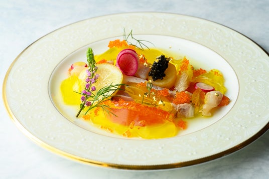 ・オードブル 海の幸のマリネ 白海老と昆布の旨みジュレ仕立て サフラン風味 キャビア添え