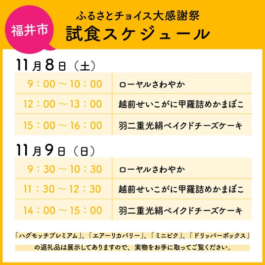 福井市ブースにお越しいただいた方にはノベルティを差し上げます!内容はランダムですが、福井市グッズや人気返礼品の試供品が入っているかも!