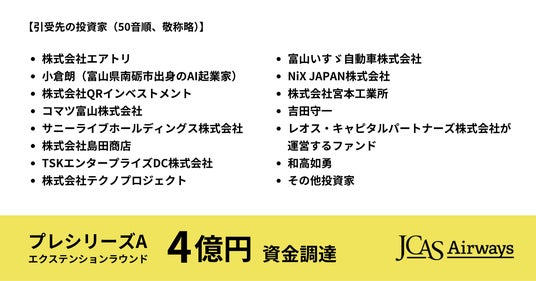 株式会社ジェイキャスエアウェイズ(本社:大阪府大阪市、代表取締役:白根清司・梅本祐紀、以下「JCAS」)は、第三者割当増資および新株予約権付社債発行を通じ、プレシリーズAエクステンションラウンドとして4億円の資金調達を実施したことをお知らせいたします。