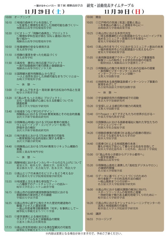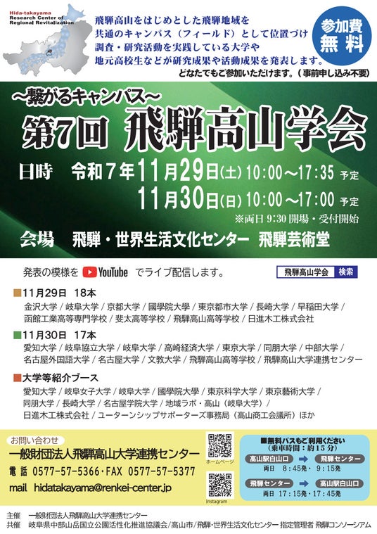 一般財団法人飛騨高山大学連携センター(岐阜県高山市)は、2025年11月29日(土)・30日(日)の2日間、「~繋がるキャンパス~第7回飛騨高山学会」を開催いたします。飛騨地域を共通のフィールド(キャンパス)として調査・研究活動を行う全国の大学生や地元高校生が、2日間で計35組の研究成果を発表。入場無料・事前申込不要で、どなたでも聴講いただけます。地域課題の解決や新たな価値創造に挑む若者たちの熱い研究発表をぜひご覧ください。